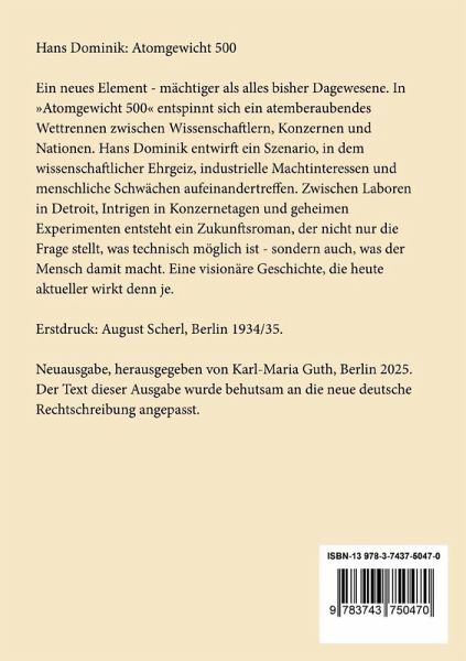 Hans Dominik: Atomgewicht 500 Ein neues Element - mächtiger als alles bisher Dagewesene. In »Atomgewicht 500« entspinnt sich ein atemberaubendes Wettrennen zwischen Wissenschaftlern, Konzernen und Nationen. Hans Dominik entwirft ein Szenario, in dem wissenschaftlicher Ehrgeiz, industrielle Machtinteressen und menschliche Schwächen aufeinandertreffen. Zwischen Laboren in Detroit, Intrigen in Konzernetagen und geheimen Experimenten entsteht ein Zukunftsroman, der nicht nur die Frage stellt, was technisch möglich ist - sondern auch, was der Mensch damit macht. Eine visionäre Geschichte, die heute aktueller wirkt denn je. Erstdruck: August Scherl, Berlin 1934/35. Neuausgabe, herausgegeben von Karl-Maria Guth, Berlin 2025. Der Text dieser Ausgabe wurde behutsam an die neue deutsche Rechtschreibung angepasst. Gesetzt aus der Minion Pro, 11 pt. Henricus - Edition Deutsche Klassik GmbH