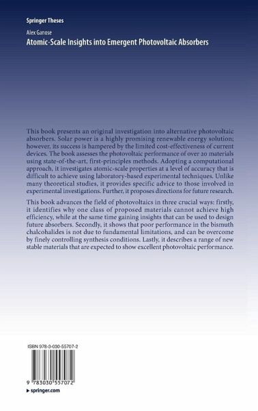 This book advances the field of photovoltaics in three crucial ways: firstly, it identifies why one class of proposed materials cannot achieve high efficiency, while at the same time gaining insights that can be used to design future absorbers. Secondly, it shows that poor performance in the bismuth chalcohalides is not due to fundamental limitations, and can be overcome by finely controlling synthesis conditions. Lastly, it describes a range of new stable materials that are expected to show excellent photovoltaic performance.
