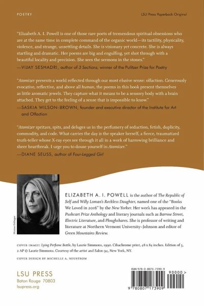 In Atomizer, Elizabeth A. I. Powell examines pressing questions of today, from equality and political unrest to the diminishing of democratic ideals, asking if it is even appropriate to write about love in a time seemingly hurtling toward authoritarianism. With honesty and humor, her poems explore fragrance and perfumery as a means of biological and religious seduction. Evoking Whitman's sentiment that we are all made of the same atoms, Atomizer looks toward an underestimated sense--scent--as a way to decipher the liminal spaces around us. Molecules of perfume create an invisible reality where narratives can unfold and interact, pathways through which Powell addresses issues of materialism, body image, and the physical and psychological contours of emotional relationships. A work of fearless social satire and humorous yet painful truth, Atomizer offers a cultural, political, and sociological account of love in the present moment.