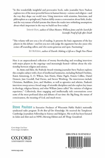 In Atoms and Eden, Peabody Award-winning journalist Steve Paulson explores these topics with some of the most prominent public intellectuals of our time, including Richard Dawkins, Karen Armstrong, E. O. Wilson, Sam Harris, Elaine Pagels, Francis Collins, Daniel Dennett, Jane Goodall, Paul Davies, and Steven Weinberg. The interviewees include Christians, Buddhists, Jews, and Muslims, as well as agnostics, atheists, and other scholars who hold perspectives that are hard to