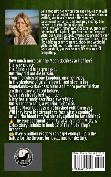 How much more can the Moon Goddess ask of her? The war is over. The Alpha and Luna are dead. But they did not die in vain. From the ashes of one kingdom, another rises. In the shadows of grief, a new threat stirs in the Roguelands-a darkness older and more powerful than anything they've faced before. Aviva has already lost too much. Misty has already sacrificed everything. But when fate calls, a warrior must rise. And the Moon Goddess isn't finished with them yet. Will they have the strength to face what's coming? Or will the blood they've already spilled be for nothing? ¿¿¿¿ The epic continuation of Aviva & Ryan and Misty & Cole's story unfolds in Book 12 of The Alpha King's Breeder. ¿¿¿¿ Over 5 million readers can't get enough-join the final battle for the throne, for love... and for destiny.