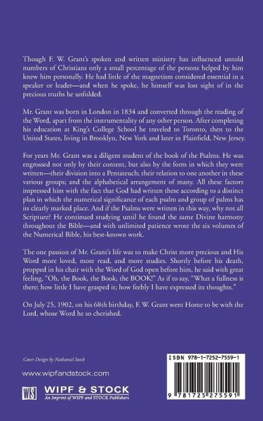 Though F. W. Grant's spoken and written ministry has influenced untold numbers of Christians only a small percentage of the persons helped by him knew him personally. He had little of the magnetism considered essential in a speaker or leader--and when he spoke, he himself was lost sight of in the precious truths he unfolded. Mr. Grant was born in London in 1834 and converted through the reading of the Word, apart from the instrumentality of any other person. After completing his education at King's College School he traveled to Toronto, then to the United States, living in Brooklyn, New York and later in Plainfield, New Jersey. For years Mr. Grant was a diligent student of the book of the Psalms. He was engrossed not only by their content, but also by the form in which they were written--their division into a Pentateuch; their relation to one another in these various groups; and the alphabetical arrangement of many. All these factors impressed him with the fact that God had written these according to a distinct plan in which the numerical significance of each psalm and group of palms has its clearly marked place. And if the Psalms were written in this way, why not all Scripture? He continued studying until he found the same Divine harmony throughout the Bible--and with unlimited patience wrote the six volumes of the Numerical Bible, his best-known work. The one passion of Mr. Grant's life was to make Christ more precious and His Word more loved, more read, and more studies. Shortly before his death, propped in his chair with the Word of God open before him, he said with great feeling, ""Oh, the Book, the Book, the BOOK!"" As if to say, ""What a fullness is there; how little I have grasped it; how feebly I have expressed its thoughts."" On July 25, 1902, on his 68th birthday, F. W. Grant went Home to be with the Lord, whose Word he so cherished.