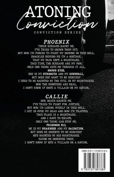 PHOENIX Their screams haunt me. I've tried to drown them out, But now I'm forced to fight my demons in this hell. Shackles remind me I'm a hostage. That my pain isn't a nightmare. This time, the screams are my own. Only one thing gets me through it all. Brown Eyes. She is my strength and my downfall. But does she want to be rescued? I used to be haunted by the evil in my nightmares. Now the monsters are real. I don't know if she's a villain or my savior. CALLIE Her death haunts me. I've tried to fight for justice, But now I'm losing myself in this hell. I got in over my head and now I'm trapped. This place is a nightmare. And I have to escape. Only one thing can stop me. Prisoner 813. He is my weakness and my salvation. But does he deserve to be rescued? He's haunted by his nightmares. Maybe he deserves them. I don't know if he's a villain or a savior. ¿¿¿¿¿¿¿ Atoning Conviction is the fifth novel in the Conviction series, which have an overarching plot throughout the series, but no cliffhanger for the couple in this book.