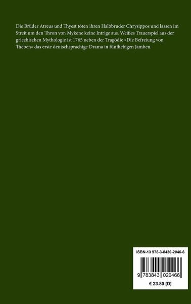 Christian Felix Weiße: Atreus und Thyest. Ein Trauerspiel in fünf Aufzügen Die Brüder Atreus und Thyest töten ihren Halbbruder Chrysippos und lassen im Streit um den Thron von Mykene keine Intrige aus. Weißes Trauerspiel aus der griechischen Mythologie ist 1765 neben der Tragödie »Die Befreiung von Theben« das erste deutschsprachige Drama in fünfhebigen Jamben. Entstanden 1766. Erstdruck in »Beytrag zum Deutschen Theater«, vierter Band, Leipzig, 1766. Vollständige Neuausgabe mit einer Biographie des Autors. Herausgegeben von Karl-Maria Guth. Berlin 2013. Textgrundlage ist die Ausgabe: Das Drama des Gegeneinander in den sechziger Jahren, Trauerspiele von Christian Felix Weiße. Herausgegeben von Dr. F. Brüggemann, Leipzig: Verlag von Philipp Reclam jun., 1938. [Deutsche Literatur, Sammlung literarischer Kunst- und Kulturdenkmäler in Entwicklungsreihen. Reihe Aufklärung Band 12]. Die Paginierung obiger Ausgabe wird in dieser Neuausgabe als Marginalie zeilengenau mitgeführt. Umschlaggestaltung von Thomas Schultz-Overhage unter Verwendung des Bildes: Maske des Thyestes, Fresko in Pompeji, um 80 v. Chr.. Gesetzt aus Minion Pro, 11 pt.