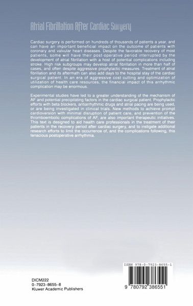 Experimental studies have led to a greater understanding of the mechanism of atrial fibrillation and potential precipitating factors in the cardiac surgical patient. Prophylactic efforts with beta-blockers, antiarrhythmic drugs and atrial pacing are being used, or are being investigated in clinical trials. New methods of achieving prompt cardioversion with minimal disruption of patient care, and prevention of the thromboembolic complications of atrial fibrillation, are also important therapeutic initiatives. This text is designed to aid health care professionals in the treatment of their patients in the recovery period after cardiac surgery, and to instigate additional research efforts to limit the occurrence of, and the complications following, this tenacious postoperative arrhythmia.