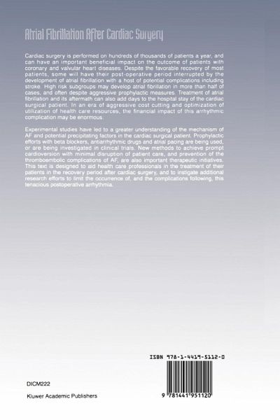 Experimental studies have led to a greater understanding of the mechanism of atrial fibrillation and potential precipitating factors in the cardiac surgical patient. Prophylactic efforts with beta-blockers, antiarrhythmic drugs and atrial pacing are being used, or are being investigated in clinical trials. New methods of achieving prompt cardioversion with minimal disruption of patient care, and prevention of the thromboembolic complications of atrial fibrillation, are also important therapeutic initiatives. This text is designed to aid health care professionals in the treatment of their patients in the recovery period after cardiac surgery, and to instigate additional research efforts to limit the occurrence of, and the complications following, this tenacious postoperative arrhythmia.
