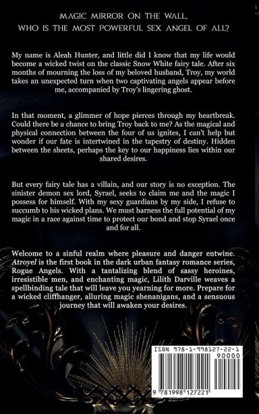 Magic mirror on the wall, who is the most powerful sex angel of all? My name is Aleah Hunter, and little did I know that my life would become a wicked twist on the classic Snow White fairy tale. After six months of mourning the loss of my beloved husband, Troy, my world takes an unexpected turn when two captivating angels appear before me, accompanied by Troy's lingering ghost. In that moment, a glimmer of hope pierces through my heartbreak. Could there be a chance to bring Troy back to me? As the magical and carnal connection between the four of us ignites, I can't help but wonder if our fate is intertwined in the tapestry of destiny. Hidden between the sheets, perhaps the key to our happiness lies within our shared desires. But every fairy tale has a villain, and our story is no exception. The sinister demon sex lord, Syrael, seeks to claim me and the magic I possess for himself. With my sexy guardians by my side, I refuse to succumb to his wicked plans. We must harness the full potential of my magic in a race against time to protect our bond and stop Syrael once and for all. Welcome to a sinful realm where pleasure and danger entwine. Atroyel is the first book in the dark urban fantasy romance series, Rogue Angels. With a tantalizing blend of sassy heroines, irresistible men, and enchanting magic, Lilith Darville weaves a spellbinding tale that will leave you yearning for more. Prepare for a wicked cliffhanger, alluring magic shenanigans, and a sensuous journey that will awaken your desires.