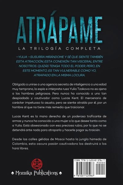 -Yulia -susurra mirándome y sé que siente también esta atracción, esta conexión tan visceral entre nosotros. Quizás tenga todo el poder, pero, en este momento, es tan vulnerable como yo, atrapado en la misma locura. Obligada a unirse a una agencia secreta de inteligencia a una edad muy temprana, la espía e intérprete rusa Yulia Tzakova no es ajena a los hombres peligrosos. Pero nunca ha conocido a uno tan despiadado y cautivador como Lucas Kent. El mercenario de carácter impetuoso la asusta, pero se siente atraída por él, por un hombre al que no tiene más remedio que traicionar. Lucas Kent es la mano derecha de un poderoso traficante de armas y nunca ha conocido a una mujer a la que desee tanto como a Yulia. Está obsesionado con esa preciosa rubia, por lo que no se detendrá ante nada para atraparla y hacerle pagar su traición. Desde las calles gélidas de Moscú hasta la jungla húmeda de Colombia, esta oscura pasión cautivadora los destruirá o los hará libres. Este práctico paquete rebajado contiene los tres libros de la serie Atrápame: Atrápame, Átame y Tómame.