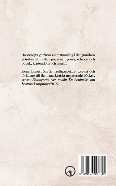 Författare är Jonas Lundström, aktivist, teolog, och frikyrkopredikanten som lämnade sin kristna tro. Jonas har tidigare skrivit fem böcker med samhällskritiska teman, senast ¿Anarkistiska blickar¿ (2019).