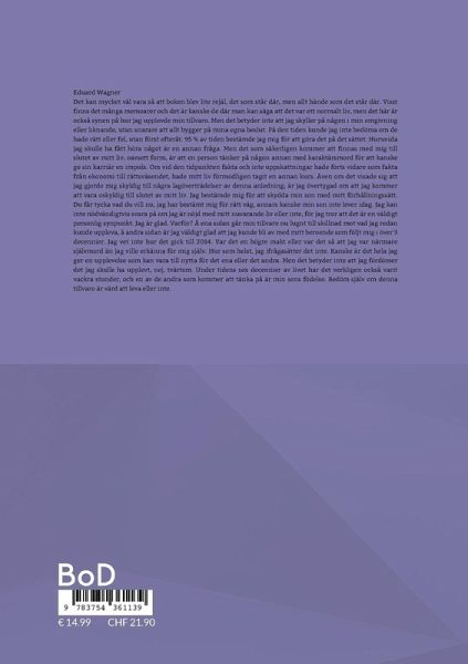 Eduard Wagner Det kan mycket väl vara så att boken blev lite rejäl, det som står där, men allt hände som det står där. Visst finns det många memoarer och det är kanske de där man kan säga att det var ett normalt liv, men det här är också synen på hur jag upplevde min tillvaro. Men det betyder inte att jag skyller på någon i min omgivning eller liknande, utan snarare att allt bygger på mina egna beslut. På den tiden kunde jag inte bedöma om de hade rätt eller fel, utan först efteråt. 95 % av tiden bestämde jag mig för att göra det på det sättet. Huruvida jag skulle ha fått höra något är en annan fråga. Men det som säkerligen kommer att finnas med mig till slutet av mitt liv, oavsett form, är att en person tänker på någon annan med karaktärsmord för att kanske ge sin karriär en impuls. Om vid den tidpunkten fakta och inte uppskattningar hade förts vidare som fakta från ekonomi till rättsväsendet, hade mitt liv förmodligen tagit en annan kurs. Även om det visade sig att jag gjorde mig skyldig till några lagöverträdelser av denna anledning, är jag övertygad om att jag kommer att vara oskyldig till slutet av mitt liv. Jag bestämde mig för att skydda min son med mitt förhållningssätt. Du får tycka vad du vill nu, jag har bestämt mig för rätt väg, annars kanske min son inte lever idag. Jag kan inte nödvändigtvis svara på om jag är nöjd med mitt nuvarande liv eller inte, för jag tror att det är en väldigt personlig synpunkt. Jag är glad. Varför? Å ena sidan går min tillvaro nu lugnt till skillnad mot vad jag redan kunde uppleva, å andra sidan är jag väldigt glad att jag kunde bli av med mitt beroende som följt mig i över 3 decennier. Jag vet inte hur det gick till 2014. Var det en högre makt eller var det så att jag var närmare självmord än jag ville erkänna för mig själv. Hur som helst, jag ifrågasätter det inte. Kanske är det hela jag ger en upplevelse som kan vara till nytta för det ena eller det andra. Men det betyder inte att jag fördömer det jag skulle ha upplevt, nej, tvärtom. Under tidens sex decennier av livet har det verkligen också varit vackra stunder, och en av de andra som kommer att tänka på är min sons födelse. Bedöm själv om denna tillvaro är värd att leva eller inte.