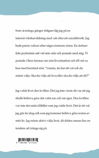 Som så många gånger tidigare låg jag på en intensivvårdsavdelning med vak efter ett suicidförsök. Jag hade precis vaknat efter några timmars sömn. En skötare från psykiatrin satt vid min sida och pratade med mig. Vi pratade i flera timmar om min livssituation och till sist sa hon med bestämd röst: Linnéa, du har ett val och du måste välja. Ska du välja att leva eller ska du välja att dö? Jag valde livet den kvällen. Det jag inte visste då var att jag skulle behöva göra det valet om och om igen. Den kvällen var inte det enda tillfället som jag valde livet. Det är ett val jag gör än idag och som jag kommer behöva göra resten av mitt liv. Jag måste aktivt välja livet, då döden annars har en tendens att tränga sig på.