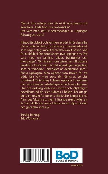 Något litet blygt och kanske nervöst inför den allra första utgivna titeln, formade jag ovanstående ord, som någon slags ursäkt för att ha skrivit boken. Vad Du nu håller i Din hand är den nya upplagan av "Att vara med: en samling dikter, berättelser och monologer". För läsaren som gärna ser till bokens innehåll i första hand är det egentligen ingenting som är förändrat, innehållet är detsamma som i första upplagan.