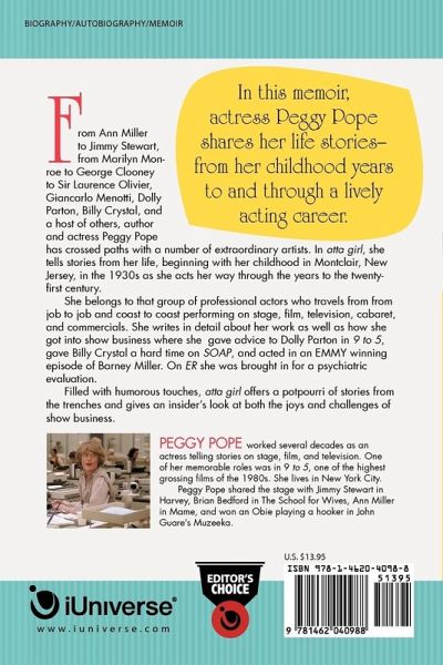 From Ann Miller to Jimmy Stewart, from Marilyn Monroe to George Clooney to Sir Laurence Olivier, Giancarlo Menotti, Dolly Parton, Billy Crystal, and a host of others, author and actress Peggy Pope has crossed paths with a number of extraordinary artists. In atta girl, she tells stories from her life, beginning with her childhood in Montclair, New Jersey, in the 1930s as she acts her way through the years to the twenty-first century. She belongs to that group of professional actors who travels from from job to job and coast to coast performing on stage, film, television, cabaret, and commercials. She writes in detail about her work as well as how she got into show business where she gave advice to Dolly Parton in 9 to 5, gave Billy Crystal a hard time on SOAP, and acted in an EMMY winning episode of Barney Miller. On ER she was brought in for a psychiatric evaluation. Filled with humorous touches, atta girl offers a potpourri of stories from the trenches and gives an insider's look at both the joys and challenges of show business.