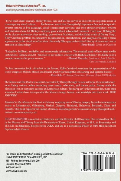 For at least a half-century Mickey Mouse, ears and all, has served as one of the most potent icons in contemporary visual culture...But however much that (deceptively) ingenuous face and unique silhouette turn up in Pop paintings, social-commentary cartoons, and even abstract sculpture, writers and historians have let Mickey's ubiquity pass without substantial comment. Until now. Defying the perils of post-modernist close reading, pop-culture fetishism, and the fabled wrath of Disney Corp., Holly Crawford proffers an exhaustive documentation, classification, and analysis of Mickey's many appearances in the visual art of our time. Her study fills a gap in the critical history of recent art, not to mention in Mouseology. -- Peter Frank, Critic and Curator Enjoyable, brilliant, readable, and enormously informative. The seminal study of how mass media institutions-Disney and Art-function in our culture, written with flashes of humor. It's likely to be a premier resource for years to come. -- Manuel Alvarado, Professor, Arts & Media, City University, London Attached to the Mouse is a result of painstaking research into this history and penetrating analysis of the psychology behind the phenomenon... For the first time, an art historian has chronicled the artists' use of Mickey as a personal language...Remaining impartial with the issues she raises in order to embrace the tension contained in this holistic vision, Crawford tackles the present-day crisis of art criticism at its core...Attached to the Mouse will prove to be an essential resource underpinning the foundation by which this search for holism comes into form. -- Lisa Paul Streitfeld Ny Arts Magazine In her innovative book Attached to the Mouse Holly Crawford examines the appropriation of the iconic images of Mickey Mouse and Donald Duck with thoughtful scholarship and spirited humor. -- Peter Selz, Professor Emeritus, History of Art, UC Berkeley