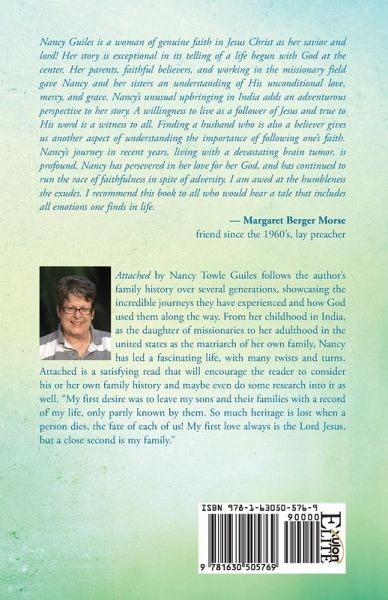 Nancy Guiles is a woman of genuine faith in Jesus Christ as her savior and lord! Her story is exceptional in its telling of a life begun with God at the center. Her parents, faithful believers, and working in the missionary field gave Nancy and her sisters an understanding of His unconditional love, mercy, and grace. Nancy's unusual upbringing in India adds an adventurous perspective to her story. A willingness to live as a follower of Jesus and true to His word is a witness to all. Finding a husband who is also a believer gives us another aspect of understanding the importance of following one's faith. Nancy's journey in recent years, living with a devastating brain tumor, is profound. Nancy has persevered in her love for her God, and has continued to run the race of faithfulness in spite of adversity. I am awed at the humbleness she exudes. I recommend this book to all who would hear a tale that includes all emotions one finds in life.-- Margaret Berger Morse, friend since the 1960's, lay preacher Attached by Nancy Towle Guiles follows the author's family history over several generations, showcasing the incredible journeys they have experienced and how God used them along the way. From her childhood in India, as the daughter of missionaries to her adulthood in the united states as the matriarch of her own family, Nancy has led a fascinating life, with many twists and turns. Attached is a satisfying read that will encourage the reader to consider his or her own family history and maybe even do some research into it as well. "My first desire was to leave my sons and their families with a record of my life, only partly known by them. So much heritage is lost when a person dies, the fate of each of us! My first love always is the Lord Jesus, but a close second is my family."