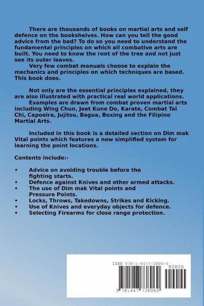 US Trade Version. Very few combat manuals choose to explain the mechanics and principles on which techniques are based. This book does. Not only are the essential principles explained, but they are also illustrated with practical real world applications. Examples are drawn from proven martial arts including Wing Chun, Jeet Kune Do, Karate, Combat Tai Chi, Capoeira, Jujitsu, Bagua, Boxing and the Filipino Martial Arts. Included in this book is a detailed section on Dim mak or Vital points which features a new simplified system for learning the point locations. Contents include:- ¿ Advice on avoiding trouble before the fighting starts. ¿ Defence against Knives and other armed attacks. ¿ The use of Dim mak Vital points and Pressure Points ¿ Locks, Throws, Takedowns, Strikes and Kicking. ¿ Use of Knives and everyday objects for defence. ¿ Selecting firearms for close range defence. Foreword by Erle Montaigue, Co-Author of the Encyclopaedia of Dim-Mak.