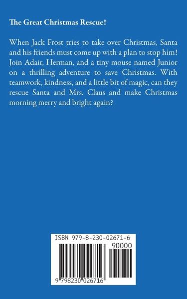 The Great Christmas Rescue! When Jack Frost tries to take over Christmas, Santa and his friends must come up with a plan to stop him! Join Adair, Herman, and a tiny mouse named Junior on a thrilling adventure to save Christmas. With teamwork, kindness, and a little bit of magic, can they rescue Santa and Mrs. Claus and make Christmas morning merry and bright again?