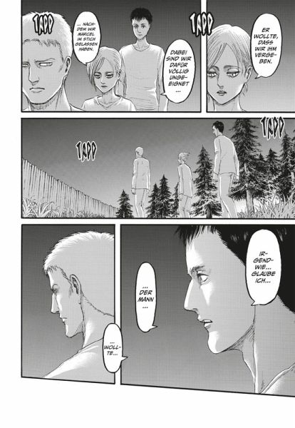 Aus Grishas Büchern und Erinnerungen erfahren Eren und die anderen, dass sie sich der ganzen Welt stellen müssen. Außerhalb der Mauern und jenseits des Meeres liegt das Reich Marley, das Paradis überfallen und den Urtitanen an sich bringen will. Doch auch dort gibt es Kinder, die verzweifelt um ihr Leben und die Zukunft kämpfen. Während Reiner, der schwer unter den Taten der Vergangenheit leidet, sichtlich geschockt wieder auf Eren trifft, beginnt kurz darauf Willy Tyburs Propagandashow...