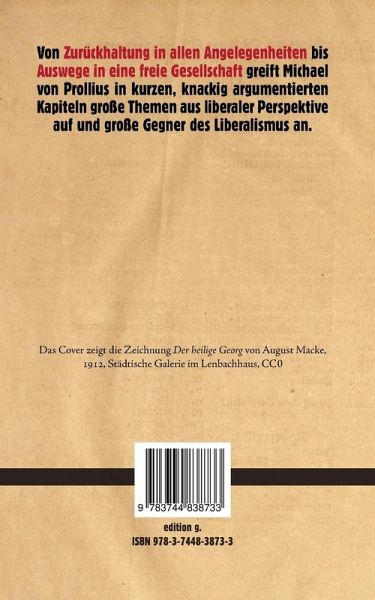 Von «Zurückhaltung in allen Angelegenheiten» bis «Auswege in eine freie Gesellschaft» greift Michael von Prollius in kurzen, knackig argumentierten Kapiteln große Themen aus liberaler Perspektive auf und große Gegner des Liberalismus an.«Wer für die Freiheit eintritt, sollte mutig sein. Freiheit ist nicht en vogue. Selbständigkeit und Verantwortung sind keine Kennzeichen unserer Zeit, sollten es aber rasch werden. Für Freiheitsfreunde dürfte die Mahatma Gandhi zugeschriebene Weisheit gelten: Zuerst ignorieren sie dich, dann lachen sie über dich, dann bekämpfen sie dich und dann gewinnst du. Die Reihenfolge scheint indes durcheinander geraten zu sein. Der klassische Liberalismus bietet bessere Ideen für die Lösung menschlicher Probleme als die seit Jahrzehnten praktizierten politischen Scheinlösungen. Viele unsichtbare Hände sind den wenigen zupackenden Pranken gestaltender Führer:innen der wenigen organisierten Interessen überlegen.» (Michael von Prollius im Vorwort.)