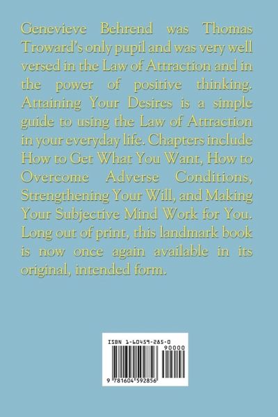 Genevieve Behrend was Thomas Troward's only pupil and was very well versed in the Law of Attraction and in the power of positive thinking. Attaining Your Desires is a simple guide to using the Law of Attraction in your everyday life. Chapters include How to Get What You Want, How to Overcome Adverse Conditions, Strengthening Your Will, and Making Your Subjective Mind Work for You. Long out of print, this landmark book is now once again available in its original, intended form.
