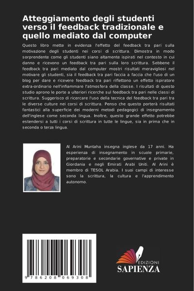 Questo libro mette in evidenza l'effetto del feedback tra pari sulla motivazione degli studenti nei corsi di scrittura. Dimostra in modo sorprendente come gli studenti siano altamente ispirati nel contesto in cui danno e ricevono un feedback tra pari sulla loro scrittura. Sebbene il feedback tra pari mediato dal computer mostri risultati meravigliosi nel motivare gli studenti, sia il feedback tra pari faccia a faccia che l'uso di un blog per dare e ricevere feedback tra pari riflettono un effetto ispiratore extra-ordinario nell'infiammare l'atmosfera della classe. I risultati di questo studio aprono le porte a ulteriori ricerche sul feedback tra pari nelle classi di scrittura. Suggerisco di ricercare l'uso della tecnica del feedback tra pari tra le diverse culture nei corsi di scrittura. Penso che questo porterà risultati fantastici alla superficie dei moderni metodi pedagogici di insegnamento dell'inglese come seconda lingua. Inoltre, questo grande effetto potrebbe estendersi a tutti i corsi di scrittura in tutte le lingue, sia in prima che in seconda o terza lingua.