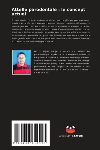 En dentisterie, l'utilisation d'une attelle est un complément précieux avant, pendant et après le traitement dentaire. Depuis plusieurs décennies, il n'existe pas de conscience uniforme sur la manière, le moment et le lieu d'utilisation de l'attelle en dentisterie. L'objectif de ce livre est de discuter en détail de la littérature actuelle disponible concernant les différents aspects de l'attelle en dentisterie, en particulier l'attelle parodontale. Ce livre sera d'une grande aide pour tous les praticiens dentaires dans la compréhension du concept actuel de l'attelle parodontale.