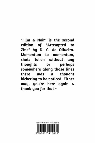 "Film and Noir" is the second edition of "Attempted to Zine" by D. C. de Oliveira. Momentum to momentum, shots taken without any thoughts or perhaps somewhere along those lines there was a thought bickering to be noticed. Either way, you're here again and thank you for that -