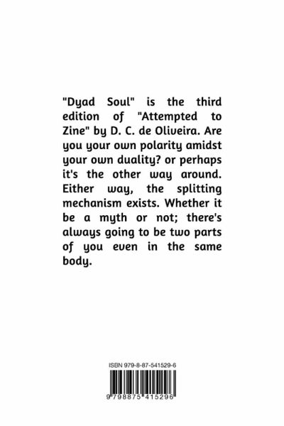 "Dyad Soul" is the third edition of "Attempted to Zine" by D. C. de Oliveira. Are you your own polarity amidst your own duality? or perhaps it's the other way around. Either way, the splitting mechanism exists. Whether it be a myth or not; there's always going to be two parts of you even in the same body.