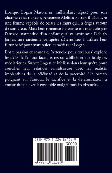 Lorsque Logan Mason, un milliardaire réputé pour son charme et sa richesse, rencontre Melissa Foster, il découvre une femme capable de briser les murs qu'il a érigés autour de son c¿ur. Mais leur romance naissante est menacée par l'arrivée inattendue d'un enfant qu'il va avoir avec Delilah James, une ancienne conquête déterminée à utiliser leur futur bébé pour manipuler les médias et Logan. Entre passion et scandale, "Attendre pour toujours" explore les défis de l'amour face aux responsabilités et aux intrigues médiatiques. Suivez Logan et Melissa dans leur quête pour concilier leur relation tumultueuse avec les réalités implacables de la célébrité et de la paternité. Un roman poignant sur l'amour, le sacrifice et la détermination à construire un avenir ensemble malgré tous les obstacles.