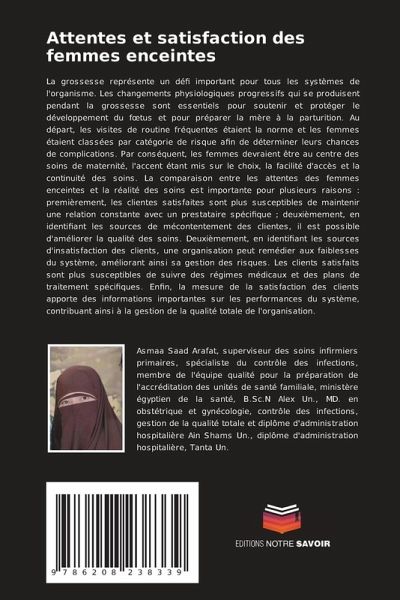 La grossesse représente un défi important pour tous les systèmes de l'organisme. Les changements physiologiques progressifs qui se produisent pendant la grossesse sont essentiels pour soutenir et protéger le développement du foetus et pour préparer la mère à la parturition. Au départ, les visites de routine fréquentes étaient la norme et les femmes étaient classées par catégorie de risque afin de déterminer leurs chances de complications. Par conséquent, les femmes devraient être au centre des soins de maternité, l'accent étant mis sur le choix, la facilité d'accès et la continuité des soins. La comparaison entre les attentes des femmes enceintes et la réalité des soins est importante pour plusieurs raisons : premièrement, les clientes satisfaites sont plus susceptibles de maintenir une relation constante avec un prestataire spécifique ; deuxièmement, en identifiant les sources de mécontentement des clientes, il est possible d'améliorer la qualité des soins. Deuxièmement, en identifiant les sources d'insatisfaction des clients, une organisation peut remédier aux faiblesses du système, améliorant ainsi sa gestion des risques. Les clients satisfaits sont plus susceptibles de suivre des régimes médicaux et des plans de traitement spécifiques. Enfin, la mesure de la satisfaction des clients apporte des informations importantes sur les performances du système, contribuant ainsi à la gestion de la qualité totale de l'organisation.