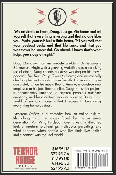 "My advice is to leave, Doug. Just go. Go home and tell yourself that everything is wrong and that no one likes you. Make yourself feel a little better. Tell yourself that your podcast sucks and that life sucks and that you won't ever be successful. Go ahead. I know that's what helps you sleep at night." Doug Davidson has an anxiety problem. A risk-averse 26-year-old virgin with a growing waistline and a shrinking social circle, Doug spends his days working on his movie podcast, The Devil Doug Guide to Horror, and neurotically checking Twitter to bolster his self-worth. His world changes completely when he meets Bueno Amore, a carefree new employee at his job. Bueno enlists Doug in his film project, a documentary intended to capture people's authentic emotions, and his assertive personality draws Doug into a world of sex and violence that threatens to take away everything he holds dear. Attention Deficit is a comedic look at online culture, filmmaking, and the issues faced by the millennial generation. Van Wright's debut novel takes a lighthearted look at modern relationships, helicopter parenting, and what happens when people who live their lives online make contact with the real world.