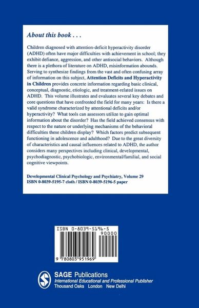 This is a concise, state-of-the-art synthesis of the vast amount of information related to attention deficits and hyperactivity in children. The author explores key issues such as: whether there is in fact a valid syndrome; which factors predict subsequent adolescent and adult functioning; and the most suitable assessment instruments. The volume encompasses a wide range of perspectives, including clinical, developmental, psychodiagnostic, psychobiological, environmental/familial and social cognitive.