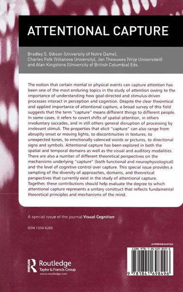 Bradley S. Gibson is Associate Professor in the Department of Psychology at the University of Notre Dame, France. Charles Folk is at the Villanova University. Jan Theeuwes is at the Vrije Universiteit, Amsterdam, the Netherlands. Alan Kingstone is at the University of British Columbia, USA.