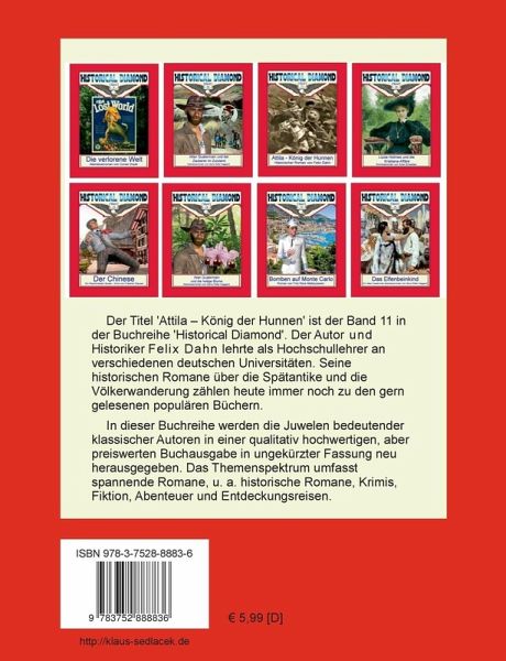 Der Titel 'Attila - König der Hunnen' ist der Band 11 in der Buchreihe 'Historical Diamond'. Der Autor und Historiker Felix Dahn lehrte als Hochschullehrer an verschiedenen deutschen Universitäten. Seine historischen Romane über die Spätantike und die Völkerwanderung zählen heute immer noch zu den gern gelesenen populären Büchern. In dieser Buchreihe werden die Juwelen bedeutender klassischer Autoren in einer qualitativ hochwertigen, aber preiswerten Buchausgabe in ungekürzter Fassung neu herausgegeben. Das Themenspektrum umfasst spannende Romane, u. a. historische Romane, Krimis, Fiktion, Abenteuer und Entdeckungsreisen.