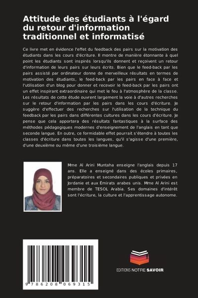 Ce livre met en évidence l'effet du feedback des pairs sur la motivation des étudiants dans les cours d'écriture. Il montre de manière étonnante à quel point les étudiants sont inspirés lorsqu'ils donnent et reçoivent un retour d'information de leurs pairs sur leurs écrits. Bien que le feed-back par les pairs assisté par ordinateur donne de merveilleux résultats en termes de motivation des étudiants, le feed-back par les pairs en face à face et l'utilisation d'un blog pour donner et recevoir le feed-back par les pairs ont un effet inspirant extraordinaire qui met le feu à l'atmosphère de la classe. Les résultats de cette étude ouvrent largement la voie à d'autres recherches sur le retour d'information par les pairs dans les cours d'écriture. Je suggère d'effectuer des recherches sur l'utilisation de la technique du feedback par les pairs dans différentes cultures dans les cours d'écriture. Je pense que cela apportera des résultats fantastiques à la surface des méthodes pédagogiques modernes d'enseignement de l'anglais en tant que seconde langue. En outre, ce formidable effet pourrait s'étendre à toutes les classes d'écriture dans toutes les langues, qu'il s'agisse d'une première, d'une deuxième ou même d'une troisième langue.