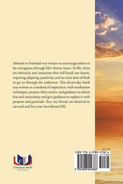 Attitude to Gratitude was written to encourage others to be courageous through life's thorny issues. In life, there are obstacles and situations that will break our hearts, requiring adapting, positivity, and an extra dose of faith to get us through the unknown. This eleven-day book was written as a method of inspiration, with meditation techniques, prayers, short stories, and guidance to release fear and uncertainty and give guidance to replace it with purpose and gratitude. You, my friend, are destined to succeed and live your best blessed life.
