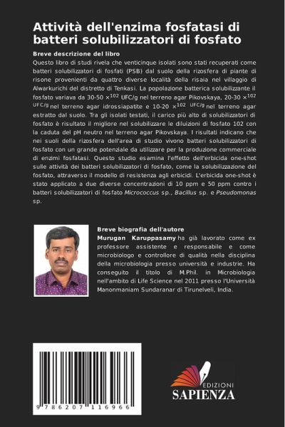 Breve descrizione del libroQuesto libro di studi rivela che venticinque isolati sono stati recuperati come batteri solubilizzatori di fosfati (PSB) dal suolo della rizosfera di piante di risone provenienti da quattro diverse località della risaia nel villaggio di Alwarkurichi del distretto di Tenkasi. La popolazione batterica solubilizzante il fosfato variava da 30-50 ×102 UFC/g nel terreno agar Pikovskaya, 20-30 ×102 UFC/g nel terreno agar idrossiapatite e 10-20 ×102 UFC/g nel terreno agar estratto dal suolo. Tra gli isolati testati, il carico più alto di solubilizzatori di fosfato è risultato il migliore nel solubilizzare le diluizioni di fosfato 102 con la caduta del pH neutro nel terreno agar Pikovskaya. I risultati indicano che nei suoli della rizosfera dell'area di studio vivono batteri solubilizzatori di fosfato con un grande potenziale da utilizzare per la produzione commerciale di enzimi fosfatasi. Questo studio esamina l'effetto dell'erbicida one-shot sulle attività dei batteri solubilizzatori di fosfato, come la solubilizzazione del fosfato, attraverso il modello di resistenza agli erbicidi. L'erbicida one-shot è stato applicato a due diverse concentrazioni di 10 ppm e 50 ppm contro i batteri solubilizzatori di fosfato Micrococcus sp., Bacillus sp. e Pseudomonas sp.