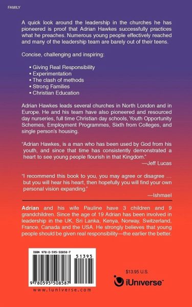 A quick look around the leadership in the churches he has pioneered is proof that Adrian Hawkes successfully practices what he preaches. Numerous young people effectively reached and many of the leadership team are barely out of their teens. Concise, challenging and inspiring: Giving Real Responsibility Experimentation The clash of methods Strong Families Christian Education Adrian Hawkes leads several churches in North London and in Europe. He and his team have also pioneered and resourced day nurseries, full time Christian day schools, Youth Opportunity Schemes, Employment Programmes, Sixth from Colleges, and single person's housing. "Adrian Hawkes, is a man who has been used by God from his youth, and since that time has consistently demonstrated a heart to see young people flourish in that Kingdom."-Jeff Lucas "I recommend this book to you, you may agree or disagree . but you will hear his heart, then hopefully you will find your own personal vision expanding."-Ishmael