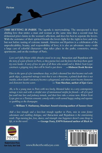 A Parisian fight-for-love story. Having just arrived in Paris, New Yorkers William, Christina, and Pascale are looking forward to six weeks of uninhibited fun with their French friends, a group of students and aspiring actors--everyone is in their early twenties, neither settled into careers nor domestic life. Adventures are soon had in Père Lachaise cemetery, at a raucous Montparnasse loft party, and under the stars in Montsouris Park. Matters become unexpectedly serious when William meets Genevieve, a native Parisian, and they fall deeply in love--a first time experience for both. As William and Genevieve begin to get to know one another an obstacle presents itself in the person of Baptiste, a childhood friend of Genevieve's who delusionally believes himself entitled to her affection and begins a campaign of interference and intimidation. So insufferable does Baptiste become that Genevieve and the group as a whole sever all ties with him; enraged at being denied direct access to Genevieve, he begins stalking her and assaults William in the street. In response, a humiliating prank is played on Baptiste in an effort to frighten him off. Instead of having the intended effect, the prank further unhinges Baptiste and propels him into outright madness--a situation that forces a violent confrontation. Love triumphs in Attraction and Repulsion, but not easily--William and Genevieve must fight through extreme tumult before enjoying their right to love one another in peace. Along the way they learn that love deepens when it suffers through opposition, and bonds of trust are stronger when forged in the fires of conflict. They also reaffirm what they already know: a circle of devoted friends is a gift beyond estimation, and fun is a very effective medication for tension. They marvel at how their chance meeting has forever altered the course of their lives. Attraction and Repulsion is a celebration of the unpredictability, beauty, and responsibility of love; it is also an adventure story--with a large cast of colorful characters--that takes place in the parks, cemeteries, streets, apartments, and on the rooftops of Paris. Reviews/Testimonials: Love can't fully bloom while obstacles stand in its way. Attraction and Repulsion tells the story of a pair of lovers in Paris, as they pursue love and the forces that keep them apart try even harder. A story of love in spite of all those who would end it, Robert Scott Leyse constructs a gripping story that will be hard to put down.--Midwest Book Review Here in the span of a few tumultuous days, in the heart of Paris, we find a dreamed love that becomes real with quick edges, a purported ménage à trois that is not a threesome, a plotted death that is not murder, where death¿s sanctuary becomes a playground, and where actors become characters and characters become actors.--Tom Sheehan, author of Epic Cures Ah, to be a young man in Paris with two lovely, liberated ladies in a very contemporary ménage à trois and with a colorful crew of international misfits for friends--all of it good fun until true love and jealousy intrude, and their lives take a serious turn. Robert Scott Leyse gives us a Parisian romantic comedy with a well-earned happy ending and repartee as sparkling as the champagne.--William T. Hathaway, Rinehart Award winning author of Summer Snow Add a love triangle and a love-hate triangle together in Paris, mix in some festive adventures and crackling dialogue, and Attraction and Repulsion is the entertaining result. Page-turning fun, love, duress, and triumph: true happiness doesn't come cheap in life, or in this novel.--George Fosty, ESPN featured author of Black Ice