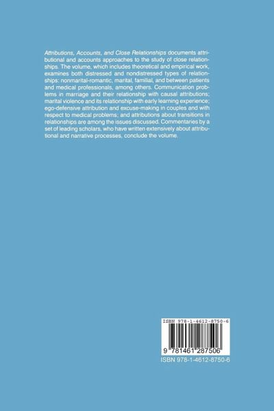 1 Introduction: Convergence of the Attribution and Accounts Concepts in the Study of Close Relationships.- 2 What Is a "Personal" Relationship? A Rhetorical-Responsive Account of "Unfinished Business".- 3 Interactions of Process and Moderator Variables in Account Episodes.- 4 Autobiographical Accounts, Situational Roles, and Motivated Biases: When Stories Don't Match Up.- 5 The Role of Account-Making in the Growth and Deterioration of Close Relationships.- 6 Coping with Relational Dissolutions: Attributions, Account Credibility, and Plans for Resolving Conflicts.- 7 Accounting for Relationships: A Knowledge Structure Approach.- 8 Communication Problems in Committed Relationships: An Attributional Analysis.- 9 Attributions and Maritally Violent Men: The Role of Cognitions in Marital Violence.- 10 Attribution Processes in Victims of Marital Violence: Who Do Women Blame and Why?.- 11 Attribution and Emotion in Patients' Families.- 12 Attributions and Apologies in Letters of Complaint to Hospitals and Letters of Response.- 13 Accounts of Intimate Support Relationships in the Early Months of Mothering.- Commentaries.- 14 Richness and Rigor: Advancing the Study of Attributions and Accounts in Close Relationships.- 15 Toward a Deeper Understanding of Close Relationships.- 16 Attributions, Accounts, and Close Relationships: Close Calls and Relational Resolutions.- 17 A Meta-Account.- Author Index.