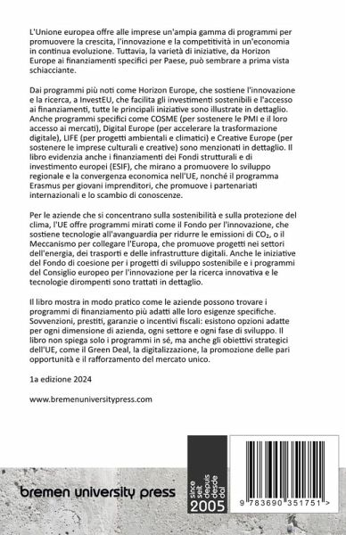 L'Unione Europea offre alle imprese un'ampia gamma di programmi per promuovere la crescita, l'innovazione e la competitività in un'economia in continua evoluzione. Ma la varietà di iniziative, da Horizon Europe ai programmi di finanziamento specifici per paese, può sembrare a prima vista schiacciante. Questo libro fornisce chiarezza e una guida solida. Dai programmi più noti come Horizon Europe, che sostiene l'innovazione e la ricerca, a InvestEU, che facilita gli investimenti sostenibili e l'accesso ai finanziamenti, tutte le principali iniziative sono spiegate in dettaglio. Anche programmi specifici come COSME (per sostenere le PMI e il loro accesso ai mercati), Digital Europe (per accelerare la trasformazione digitale), LIFE (per progetti ambientali e climatici) e Creative Europe (per sostenere le imprese culturali e creative) sono menzionati in dettaglio. Il libro evidenzia anche i finanziamenti dei Fondi strutturali e di investimento europei (ESIF), che mirano a promuovere lo sviluppo regionale e la convergenza economica nell'UE, nonché il programma Erasmus per giovani imprenditori, che promuove i partenariati internazionali e lo scambio di conoscenze. Per le aziende che si concentrano sulla sostenibilità e sulla protezione del clima, l'UE offre programmi mirati come il Fondo per l'innovazione, che sostiene tecnologie all'avanguardia per ridurre le emissioni di CO¿, o il Meccanismo per collegare l'Europa, che promuove progetti nei settori dell'energia, dei trasporti e delle infrastrutture digitali. Anche le iniziative del Fondo di coesione per i progetti di sviluppo sostenibile e i programmi del Consiglio europeo per l'innovazione per la ricerca innovativa e le tecnologie dirompenti sono trattati in dettaglio. Il libro mostra in modo pratico come le aziende possono trovare i programmi di finanziamento più adatti alle loro esigenze specifiche. Sovvenzioni, prestiti, garanzie o incentivi fiscali: esistono opzioni adatte per ogni dimensione di azienda, ogni settore e ogni fase di sviluppo. Il libro non spiega solo i programmi in sé, ma anche gli obiettivi strategici dell'UE, come il Green Deal, la digitalizzazione, la promozione delle pari opportunità e il rafforzamento del mercato unico. Con consigli pratici sulle procedure di candidatura, le scadenze e i requisiti per le aziende, questo libro aiuta a padroneggiare l'iter burocratico. È il supporto ideale per chiunque voglia beneficiare delle opportunità offerte dall'UE, che si tratti di aprire nuovi mercati, promuovere la ricerca e lo sviluppo o investire nella sostenibilità e nella digitalizzazione. Stato di avanzamento: dicembre 2024