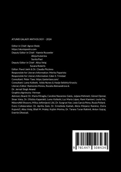 ATUNIS GALAXY ANTHOLOGY - 2024 ANTHOLOGY OF CONTEMPORARY WORLD POETRY ATUNIS POETRY LEADERSHIP STAFF: Editor in Chief: Agron Shele https://atunispoetry.com Deputy Editor in Chief: Hannie Rouweler Alicja Kuberska Sunita Paul Deputy Editor in Chief : Alisa Velaj Susana Roberts Editor: Pavol Janik & Dr. Claudia Piccinno Responsible for Literary Information: Merita Paparisto Responsible for Literary Information: Eden S. Trinidad Consultant: Peter Tase: https://petertase.com/ Consultant: Lumo Kolleshi, Isilda Nunes & Hasije Selishta Kryeziu Literary Editor: Raimonda Moisiu, Rozalia Aleksandrova & Dr. Jernail Singh Anand Graphics: Agnieszka Herman Advisory Board: Dr. Maria Miraglia, Caroline Nazareno-Gabis, Juljana Mehmeti, Günsel Djemal, Sinan Vaka, Dr. Eftichia Kapardeli, Lumo Kolleshi, Luz María López, Rami Kamberi, Leyla I¿¿k, NilavroNill Shoovro, Milica Jeftimijevi¿ Lili¿, Dr. Sungrye Han, Leda García Pérez, Roula Pollard. Every Collaboration: Dr. Aprilia Zank, Dr. Ermelinda Kashah, Alicia Minjarez Ramírez, Elvira Kujovic¿, Alisa Velaj, Bilall M. Maliqi, Kujtim Morina, Dr. Tarana Turan Rahimli, Anton Gojcaj, Enertin Dheskali.