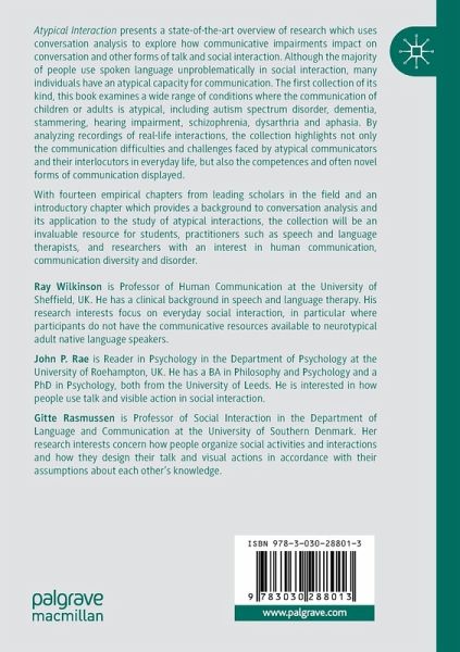 Atypical Interaction presents a state-of-the-art overview of research which uses conversation analysis to explore how communicative impairments impact on conversation and other forms of talk and social interaction. Although the majority of people use spoken language unproblematically in social interaction, many individuals have an atypical capacity for communication. The first collection of its kind, this book examines a wide range of conditions where the communication of children or adults is atypical, including autism spectrum disorder, dementia, stammering, hearing impairment, schizophrenia, dysarthria and aphasia. By analyzing recordings of real-life interactions, the collection highlights not only the communication difficulties and challenges faced by atypical communicators and their interlocutors in everyday life, but also the competences and often novel forms of communication displayed.