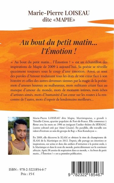 "Au bout du petit matin... L'émotion!" est un échantillon des inspirations de Mapie de 2009 à aujourd'hui. Sa poésie se réveille quasiment toujours sous le coup d'une émotion. Ainsi, ce sont des paroles d'Amour traduisant tous les états de son coeur face à son histoire et celles des autres devenues siennes par la magie de la poésie : mots d'amours heureux ou malheureux, mots militants criant face au manque d'amour du monde, mots de moments intimes, mots échos d'artistes aimés, mots d'humanité d'un coeur sur les routes à la rencontre de l'autre, mots d'espoir de lendemains meilleurs...