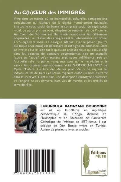 Vivre dans un monde où les individualités culturelles partagent une cohabitation qui fabrique de la dignité humainement équitable, émettra le souci social de bannir le complexe social de supériorité, racial, de partis pris, en tout, d'ingérence sentimentale de l'homme. Au Coeur de l'homme est l'humanité nonobstant les différences corporelles ; au cHoeur des immigrés est la détermination et l'inter-encouragement social. Le dialogue adéquat avec le patient (l'autre qui toque chez-nous) est nécessaire et est signe de confiance. Dans ce livre je pose le jalon sur la question philosophique qui circule déjà dans les bouches de penseurs postmodernes, soit on accueille l'autre tel ''autre'' qu'on traitera avec toute indifférence, soit on l'accueille telle ma partie manquante avec qui je me réalise et je vaincs les caprices postmodernes. Voilà "HOMOCENTRISME" de Mpala Mbabula. Ce livre dénude les profondeurs de migrant tel individu et tel de frères et soeurs migrants enthousiasmés d'atterrir dans leurs rêves. C'est-à-dire, une description prototype scrutatrice de l'origine de ces derniers, leurs vies de marche et les réalités de terre de rêve.