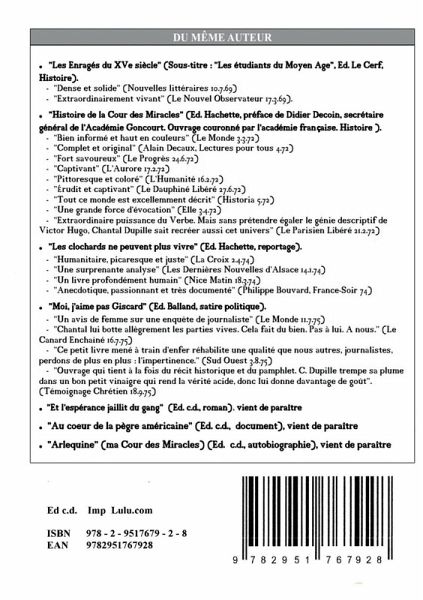 A la fois reportage, témoignage, document choc (parfois aux accents sociologiques) sur la pègre américaine: gangs de rues ou criminels, drogue, prostitution, motorcycle's gangs.. Chantal Dupille, journaliste-écrivain (Lauréate Académie Française) et blogueuse, a plongé au coeur des ghettos, particulièrement à N.Y. Toutes les portes lui ont été ouvertes, même les plus impénétrables, grâce à la Police qui s'est mise à sa disposition (consultation d'archives publiques et privées, accompagnement de patrouilles..); elle a aussi bénéficié de l'appui de missionnaires évangéliques et d'intervenants locaux variés. Dix ans de travail, un document rare, exceptionnel, et qui se lit agréablement (accessible à tout public). Proposé à un seul éditeur, Fayard (spécialisé entre autres dans les reportages chocs) vivement intéressé par le traitement du sujet, mais le voulant plus actualisé (alors que pratiquement rien n'a changé), donc l'auteur s'est chargée elle-même de l'édition de l'ouvrage.
