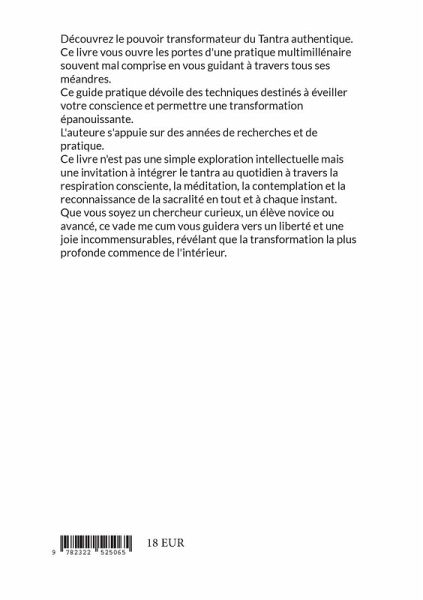 Découvrez le pouvoir transformateur du Tantra authentique. Ce livre vous ouvre les portes d'une pratique multimillénaire souvent mal comprise en vous guidant à travers tous ses méandres.Ce guide pratique dévoile des techniques destinés à éveiller votre conscience et permettre une transformation épanouissante.L'auteure s'appuie sur des années de recherches et de pratique.Ce livre n'est pas une simple exploration intellectuelle mais une invitation à intégrer le tantra au quotidien à travers la respiration consciente, la méditation, la contemplation et la reconnaissance de la sacralité en tout et à chaque instant.Que vous soyez un chercheur curieux, un élève novice ou avancé, ce vade me cum vous guidera vers un liberté et une joie incommensurables, révélant que la transformation la plus profonde commence de l'intérieur.