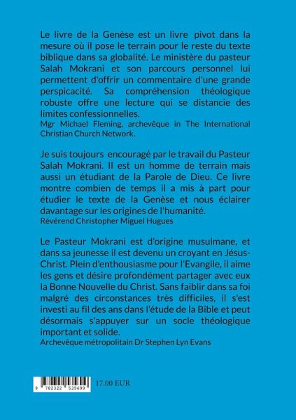 Le livre de la Genèse est un livre pivot dans la mesure où il pose le terrain pour le reste du texte biblique dans sa globalité. Le ministère du pasteur Salah Mokrani et son parcours personnel lui permettent d'offrir un commentaire d'une grande perspicacité. Sa compréhension théologique robuste offre une lecture qui se distancie des limites confessionnelles. Mgr Michael Fleming, archevêque in The International Christian Church Network.