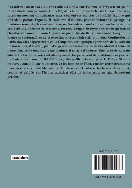 " La matinée du 10 mai 1774, à Versailles, s¿écoula dans l¿attente de l¿événement qui ne faisait doute pour personne. Louis XV, dans la nuit précédente, avait bien, il est vrai, repris un moment connaissance, mais c¿étaient ces minutes de lucidité fugitive qui précèdent parfois l¿agonie. Il était prêt d¿ailleurs, pour le redoutable passage, sa maîtresse renvoyée, les sacrements reçus, les ordres donnés, de sa bouche, pour que son petit-fils, l¿héritier de son trône, fût tenu éloigné du foyer d¿infection qüétait sa chambre de mourant. Louis-Auguste, naguère Duc de Berry, maintenant Dauphin de France, se conformait, en sujet respectueux, à cette injonction suprême. Confiné depuis l¿aube dans les appartements de la Dauphine, avec quelques personnes de sa suite ou de son service, il guettait, plein d¿angoisse, les messagers qui se succédaient d¿heure en heure. Une seule fois, dans cette matinée, il fit acte d¿autorité. Une lettre de sa main adressée à l¿abbé Terray, contrôleur général, lui prescrivait de distribuer aux pauvres de Paris une somme de 200 000 livres, afin qüils priassent pour le Roi : « Si vous trouvez, ajoutait-il, que ce soit trop, vu les besoins de l¿État, vous les retiendrez sur ma pension et sur celle de Madame la Dauphine. » Cet ordre et les termes de ce billet, connus et publiés sur l¿heure, excitaient déjà de toutes parts un attendrissement général."