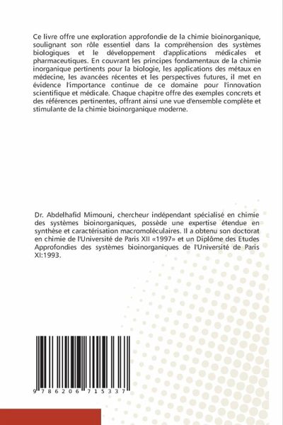Ce livre offre une exploration approfondie de la chimie bioinorganique, soulignant son rôle essentiel dans la compréhension des systèmes biologiques et le développement d'applications médicales et pharmaceutiques. En couvrant les principes fondamentaux de la chimie inorganique pertinents pour la biologie, les applications des métaux en médecine, les avancées récentes et les perspectives futures, il met en évidence l'importance continue de ce domaine pour l'innovation scientifique et médicale. Chaque chapitre offre des exemples concrets et des références pertinentes, offrant ainsi une vue d'ensemble complète et stimulante de la chimie bioinorganique moderne.